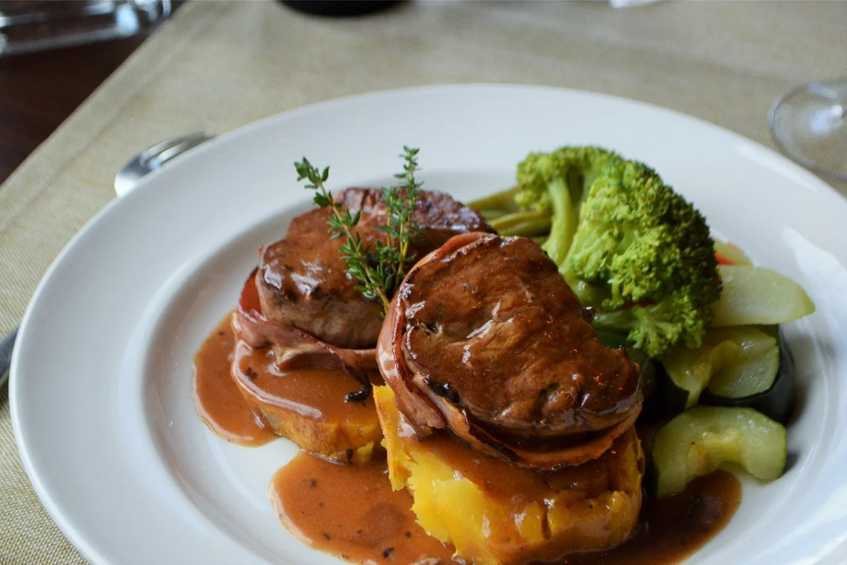 Served with sweet potatoes and vegetables. Irresistible sauce prepared with Madeira wine that, when combined with bacon, results in a harmonious combination of flavors.
