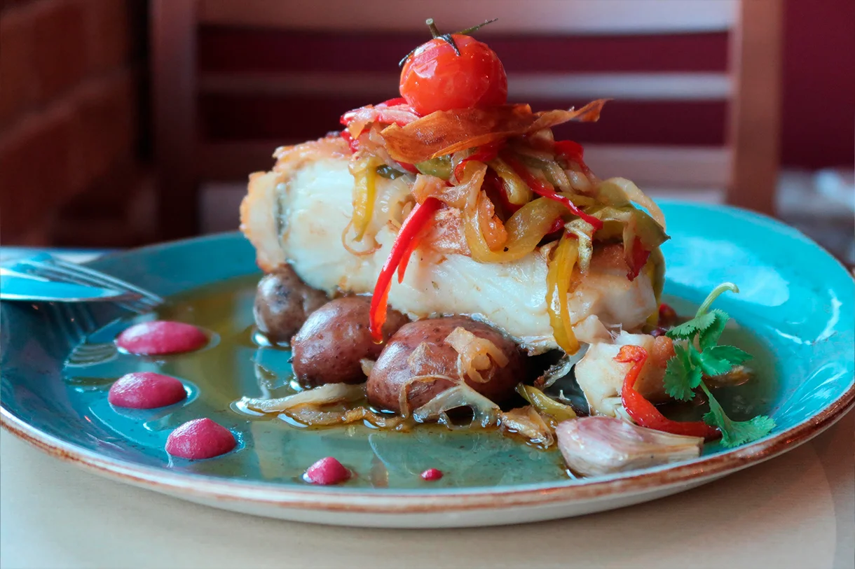 Delicious cod fillet prepared with onion, garlic, red pepper and smashed potatoes, served with plenty of olive oil.