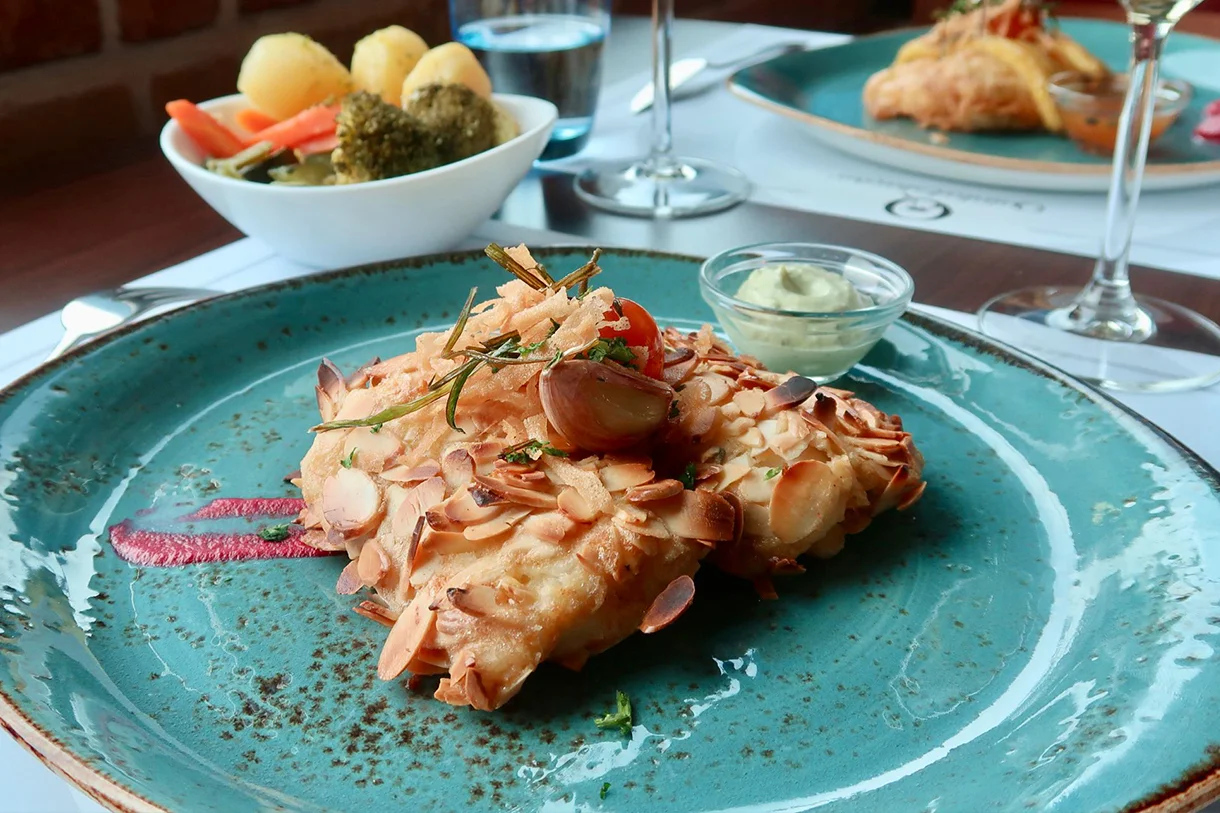The almond crust gives a crunchy touch to our sword fillet and accompanied by a garlic sauce that provides a delicious flavor.