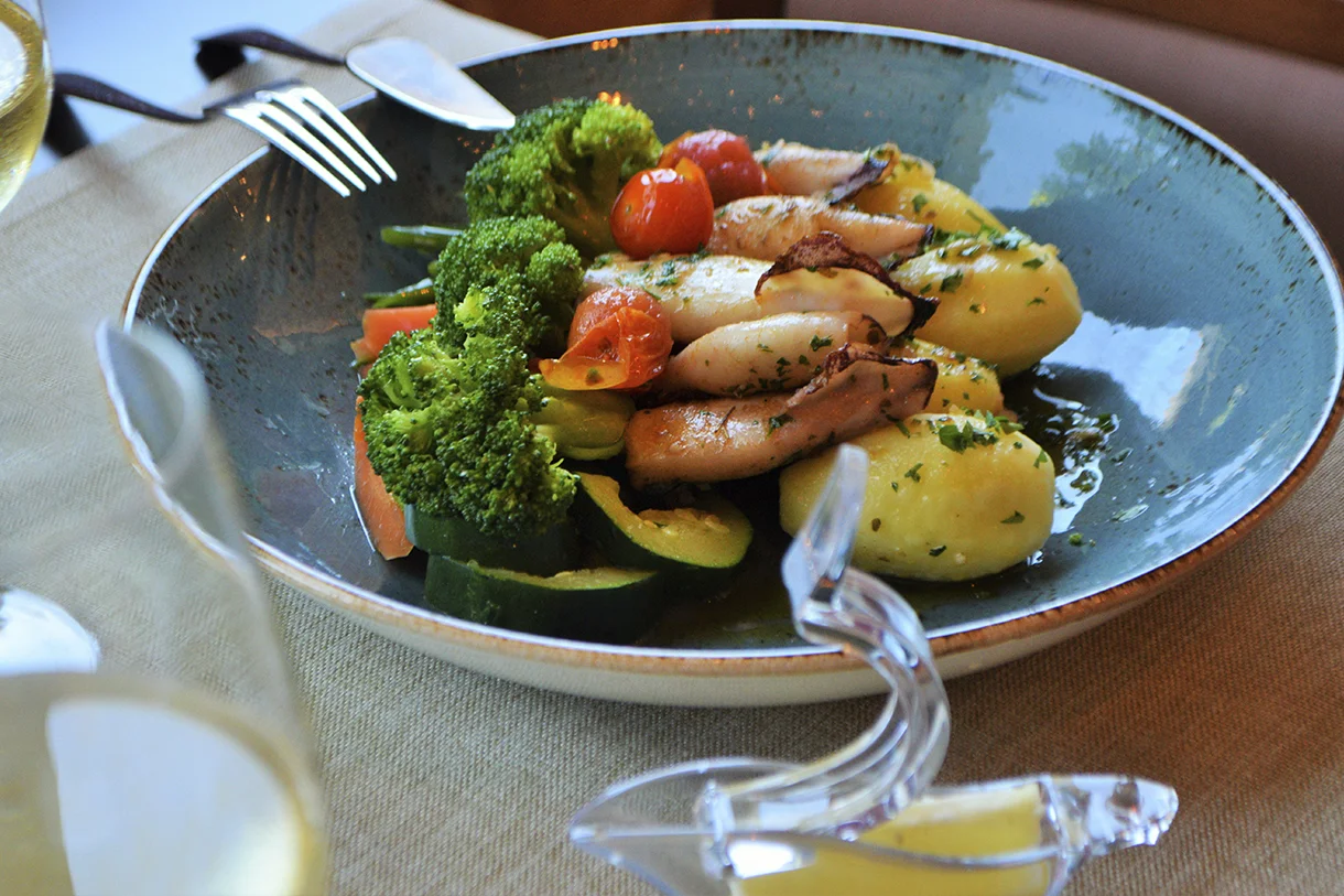 Tender octopus well coated in olive oil, seasoned with garlic, onion and red pepper and accompanied by mashed potatoes.
