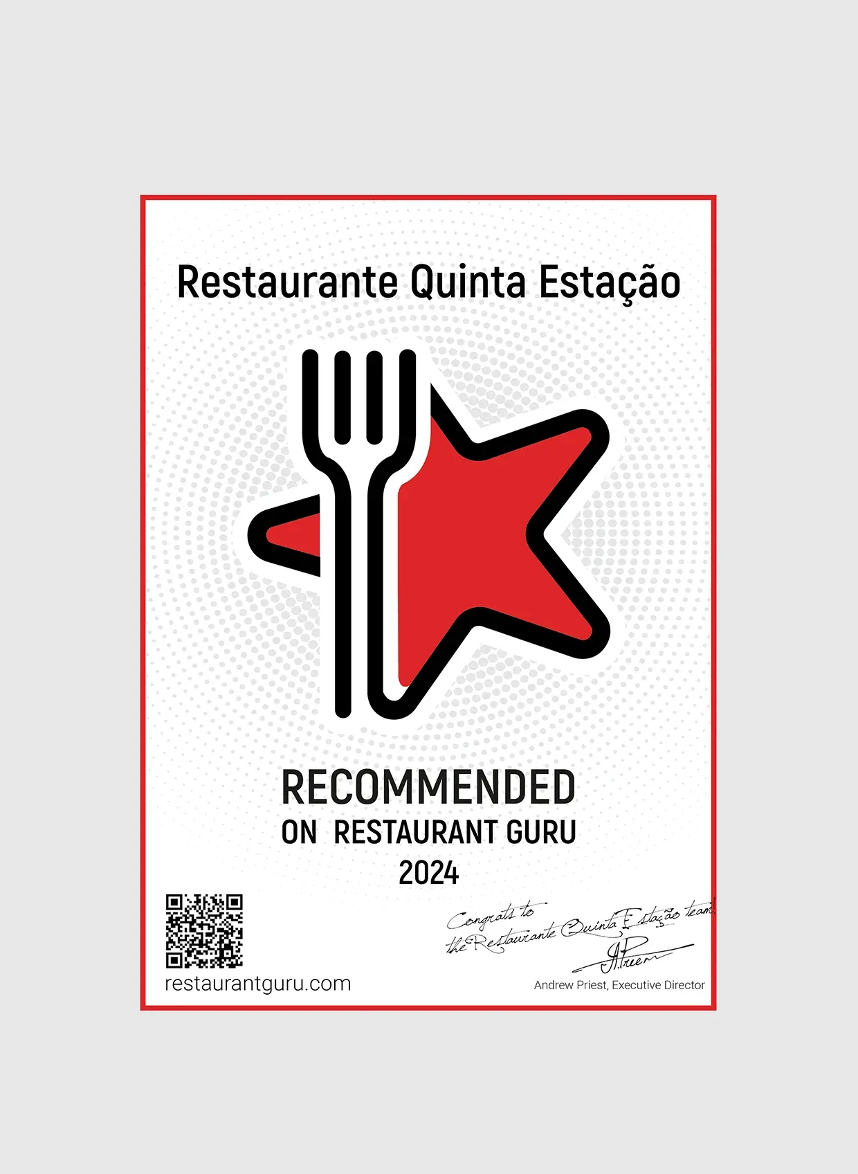 É com grande alegria que partilhamos convosco uma notícia emocionante: o Restaurante Quinta Estação foi distinguido com o emblema de Recomendação pelo Restaurant Guru!